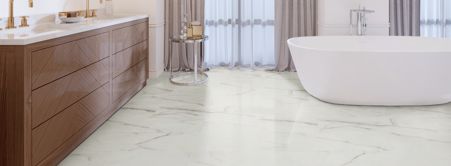 Transform your bathroom into a serene retreat with waterproof white vinyl floor tiles or planks. The moisture-resistant properties of vinyl make it excellent for bathroom settings, where traditional hardwood can warp and tile can feel cold underfoot. White vinyl offers a bright, clean look that is perfect for creating a spa-like atmosphere in your bathroom. Dive into options at Carpet One's bathroom flooring page.